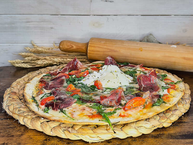 Tomate, mozzarella, rúcula, tomate cherry, jamón ibérico, burrata y aceite de albahaca