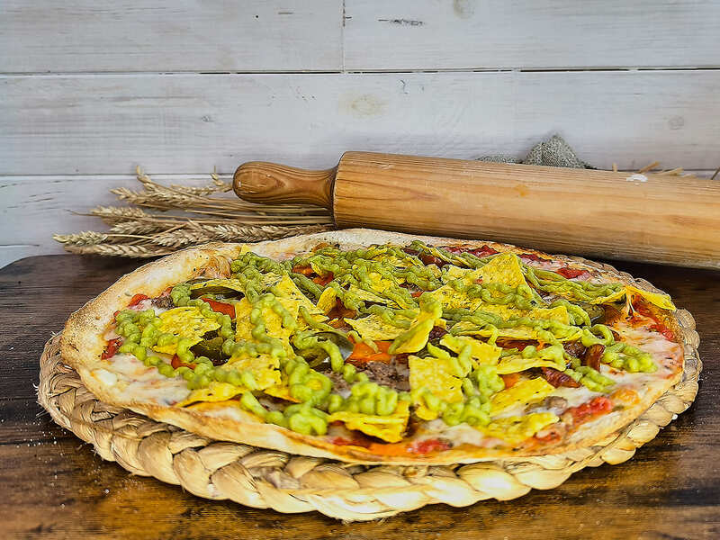 Tomate, mozzarella, carne picada, chorizo, pimiento rojo, jalapeños, guacamole y nachos.