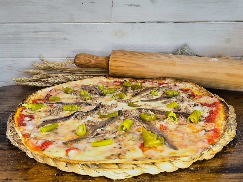 Tomate, mozarrella, atún, anchoa, guindilla y aceite de oliva