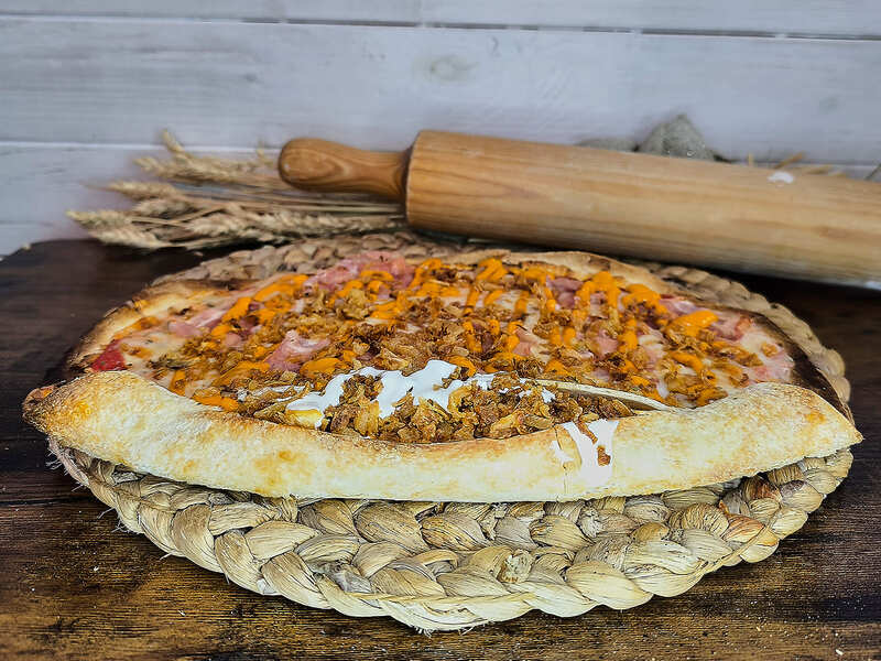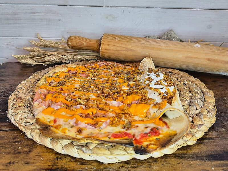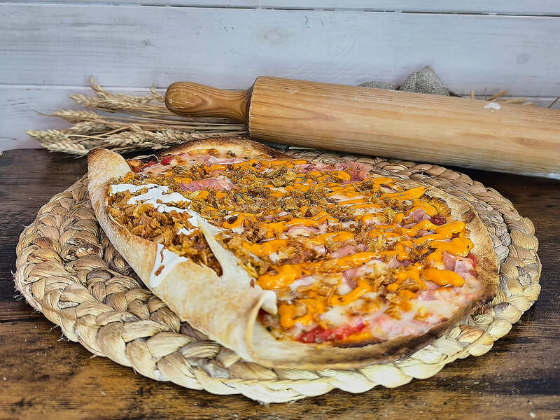 La pizza BRAVA es un auténtico placer para los amantes de los sabores intensos. Con una base de tomate y mozzarella, se complementa con beicon, cebolla crujiente, perrito caliente y un toque de salsa brava y alioli. Cada bocado es una explosión de sabores atrevidos que hará vibrar tu paladar. Ideal para quienes disfrutan de una combinación picante y reconfortante.