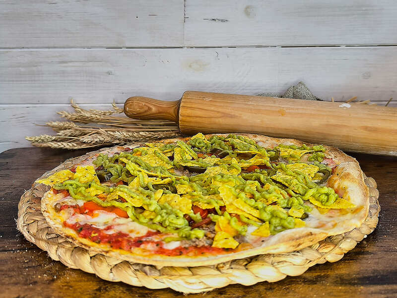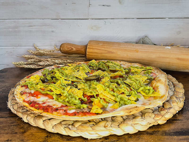 Tomate, mozzarella, carne picada, chorizo, pimiento rojo, jalapeños, guacamole y nachos.