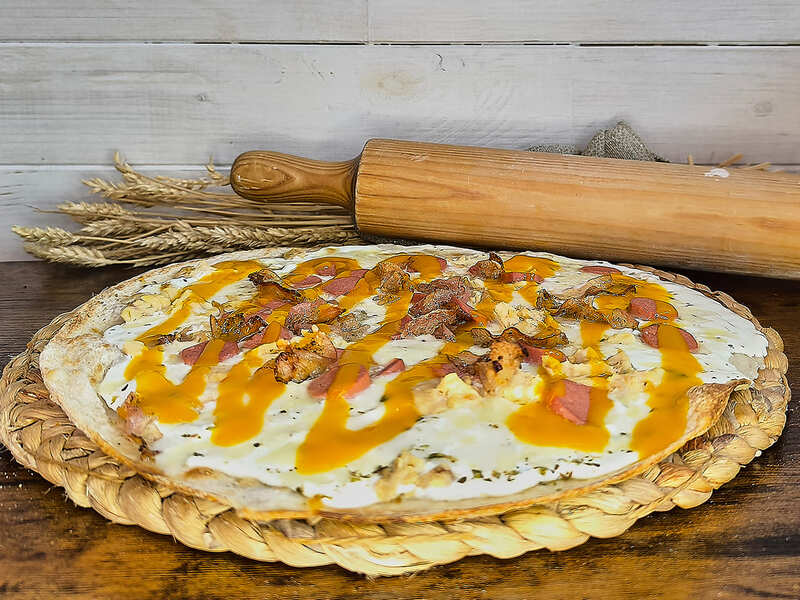 Yogur, mozzarella, pollo, salchichas, guanciale y reducción de mango